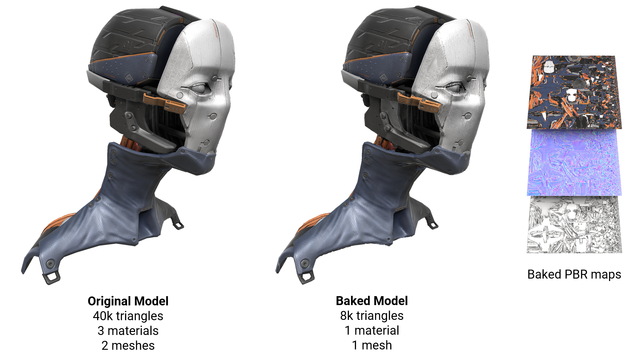Use this feature as part of your mesh optimization process to transfer mesh and materials information to texture maps.