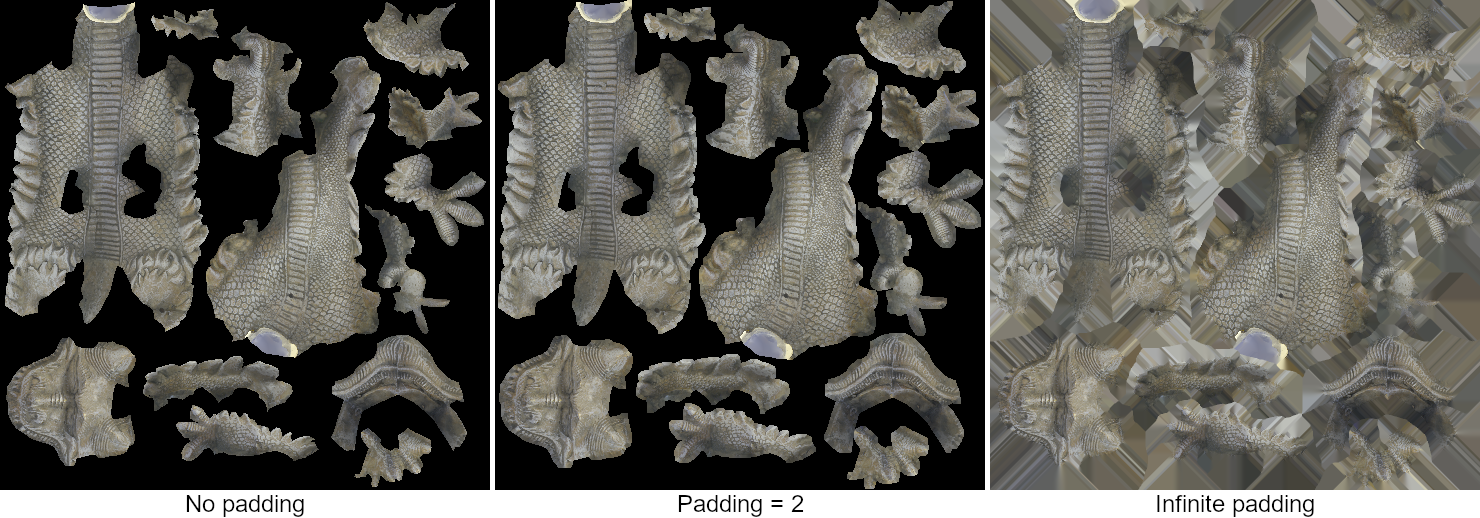 Padding is the process of expanding the baked areas in texture space by propagating valid pixel values to undefined ones. This is particularly useful to avoid visible seams during rendering due to bilinear interpolation or mip-mapping. It is defined by a number of pixels, which corresponds to the width of the dilation to apply. The following example shows the same map baked with different padding values: