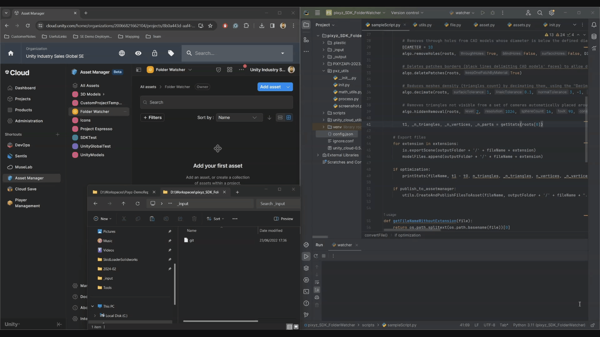 GitHub That second sample expands the previous script and enables a "batch processing" of 3D assets into a folder watcher configuration. Any compatible 3D files copied into an "input" folder will automatically be transformed according to a specific optimization scenario.