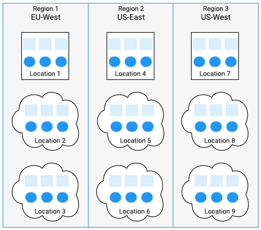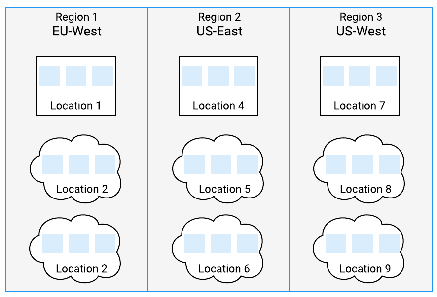 Within a single fleet, servers run in a location, which is part of a region. For example, in the following diagram, Region 1 is called EU-West and has locations in western Europe, with one bare metal data center and two cloud availability zones.![]() |
