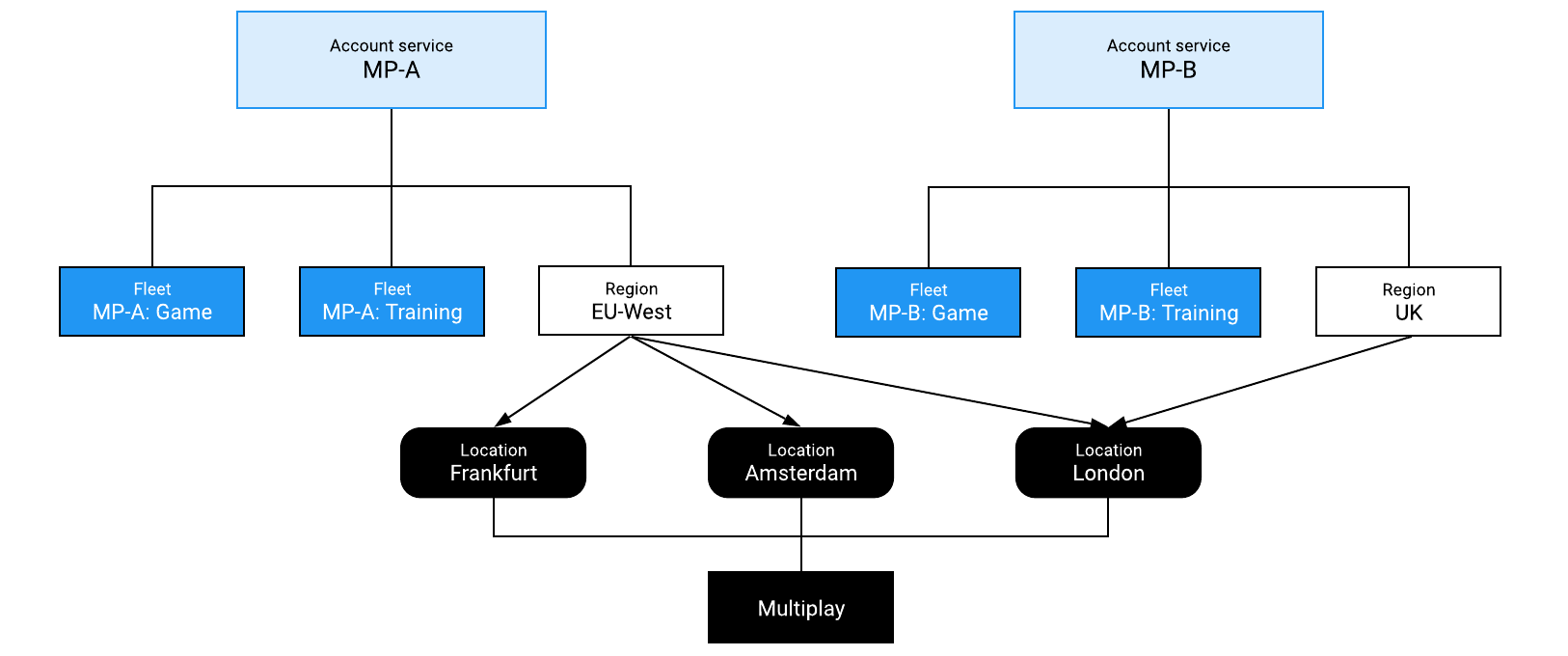 The physical location of a machine that's hosting a game server is called its location. A location typically corresponds to a bare metal data center or a cloud provider's availability zone. Clanforge defines locations, and can host games from many different fleets and account services. Clanforge can also group locations together to form a region. A region is one step above a location and acts as an availability zone; if one location experiences issues, then Clanforge can use servers in another location within the same region. A region usually has at least one bare metal location and at least one cloud location. With this configuration, Clanforge can scale into the cloud when there are no more available servers on the bare metal machines. An account service owns a region, but the region can be shared by many fleets under the same account service. The following diagram shows an example configuration of locations and regions, using the games from the previous example.