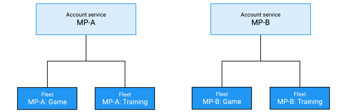 < Note: For separate fleets of the same game (for example, a production fleet versus a development fleet), you would likely use the same account service.