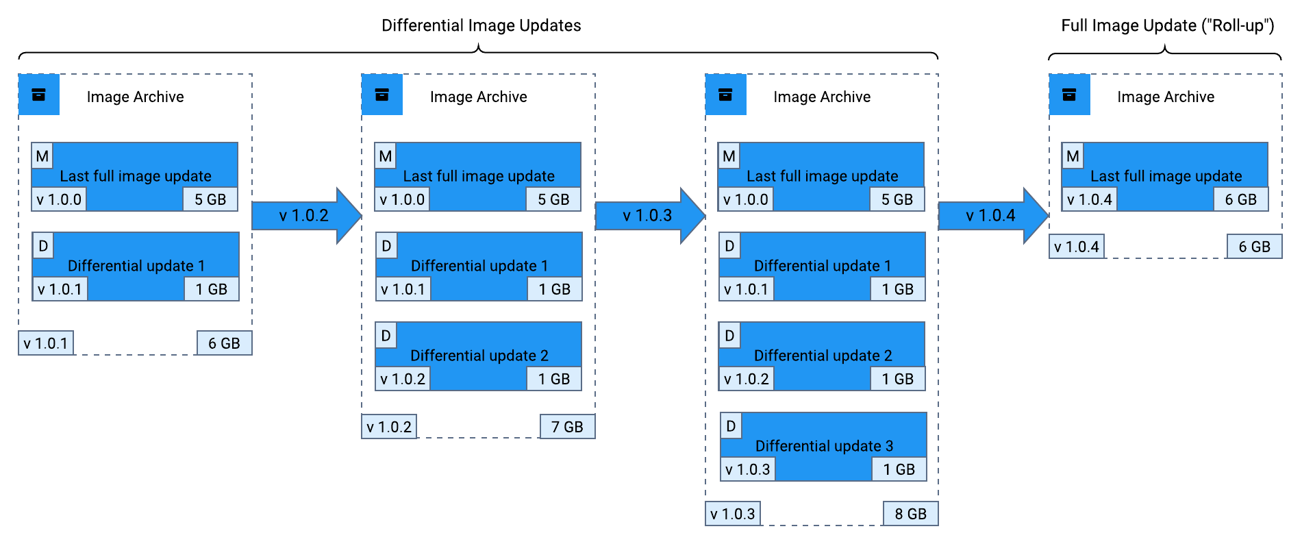 Pushing a full image updateWhen you push out another full image version later, Clanforge consolidates all the differential updates into the primary image and then updates the primary image version to the next version. In the following diagram, image version 1.0.4 is a full image version. When Clanforge pushes out version 1.0.4 to the fleet machines in this example, it consolidates all the differential updates into one primary version. As a result, the total disk space that version 1.0.4 consumes (6 GB) is less than the total disk space that the earlier version 1.0.3 consumed (9 GB).
