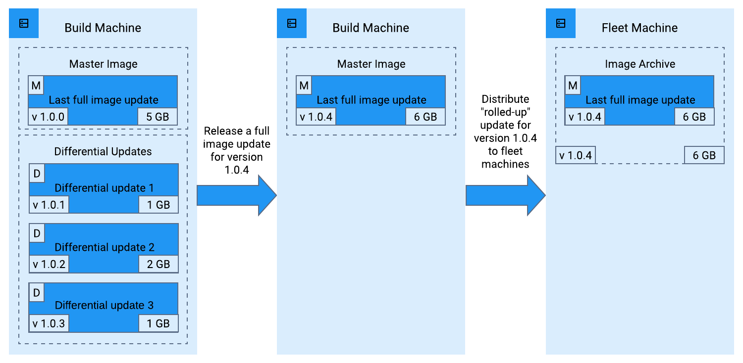 Distributing a rolled-up update to fleet machinesIn addition to your game image consuming less space on your machines, there are other benefits to using a full image update. Your fleet likely consists of a baseline set of bare metal machines and any number of as-needed ephemeral cloud instances. Clanforge creates cloud instances in response to player demands. When Clanforge spins up one of these instances, it sends the entire image archive to the instance before it’s ready to accept players. For example, if the last several updates you released were differential updates, Clanforge would need to send the primary image plus the number of differential images you created since the last full image update, which over time, can add up to a large image size. When your cloud instances have to download such a large archive, it can result in an unnecessarily large amount of buffered capacity to compensate.