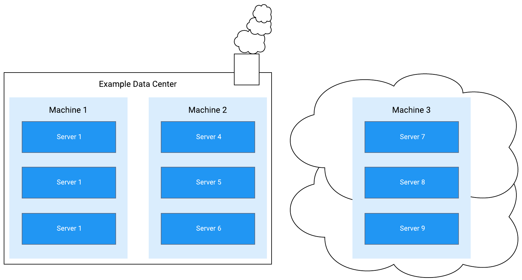 Machines are owned by a fleet and run in a specific location. Note that you can only allocate the servers on a machine if that machine belongs to a region. There are normally multiple servers hosted on one machine. Because machines and servers are part of a fleet, only servers that belong to that fleet run on a machine.
