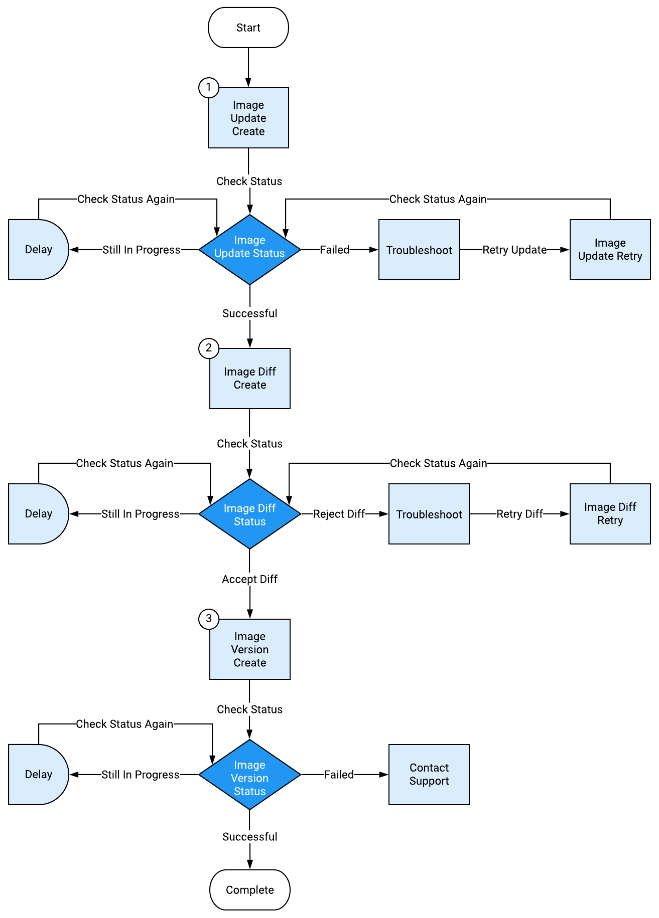 To accept the changes generated from the diff analysis, use the Image Version Create endpoint with the diff ID that the Image Diff Create request returned. The Image Version Create endpoint uses the diff analysis (as specified by the diff ID in the request body), packages the differences, and once complete triggers a rollout to your fleet. After you’ve called the Image Version Create endpoint, you can call the Image Version Status endpoint to check the status of this packaging process. The following table describes the statuses (job states) of the Image Version Status endpoint.Job State ID ( | Description |