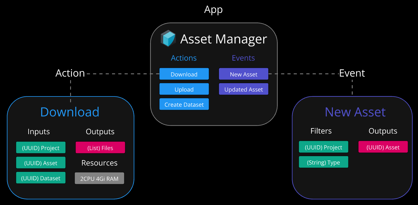 Apps contain actions that integrate with the tool or service they represent. These actions are executed in pipeline steps. For example, the Asset Manager app has an action that enables you to upload files to an asset in Asset Manager. You can combine actions from different apps in your pipeline. You can configure an action's behavior using its input parameters, which can reference data within your pipeline. When an action completes, it provides output parameters which can be referenced by subsequent steps in the pipeline. For example, you can configure Unity Asset Transformer to ingest a specific asset for transformation and then reference the transformed output file. Actions are versioned to ensure updates from app creators don’t break your pipelines. For example, if an action is updated to have a new required input parameter, your pipeline will continue to use the older version to function as expected. Some actions require compute resources and can be configured to use a hardware profile that's appropriate for your pipeline. For small assets, choose a profile with low memory capacity. For larger assets, select one with higher memory capacity.Events