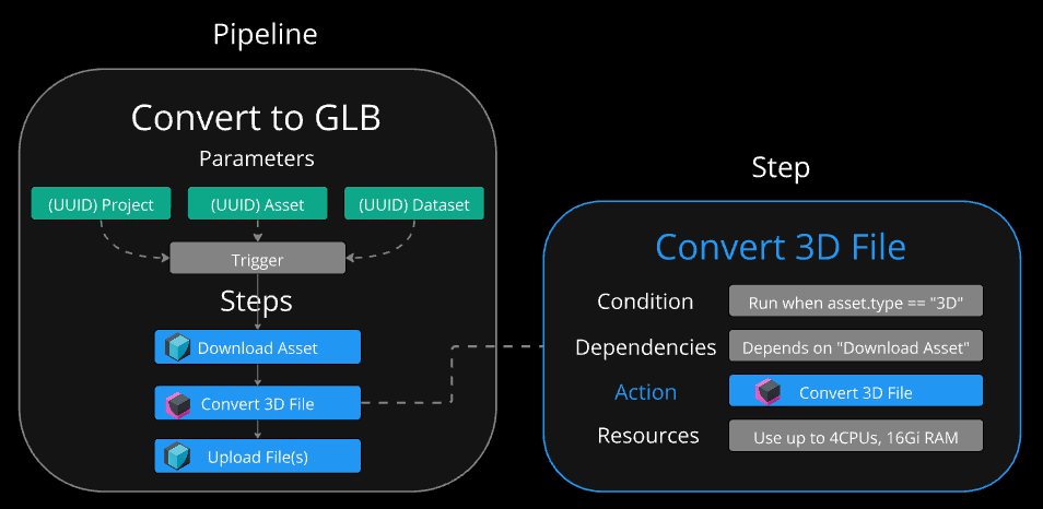 When a pipeline is triggered, it may require certain parameters to be passed to it. Pipeline parameters enable your pipelines to be more flexible, dynamic, and reusable. If you have a pipeline that converts 3D models to a specific format like.glbSteps
