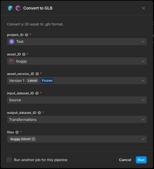 To provide the parameters required to trigger the pipeline, you will need to reference a 3D asset in Asset Manager. Here is a sample model that you can use to test with.A dataset for transformed data