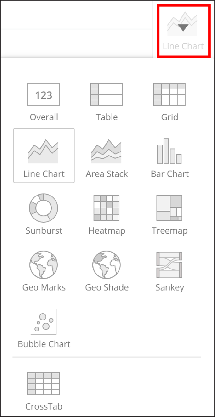 As you add or subtract dimensions, Report Builder automatically changes to a chart type that might work better for your data. You can change back, or choose another chart type, by clicking the chart type dropdown. As you change chart types, Report Builder might prompt you to add or subtract dimensions. To explore the different charts available, select the dropdown that displays the current chart type.