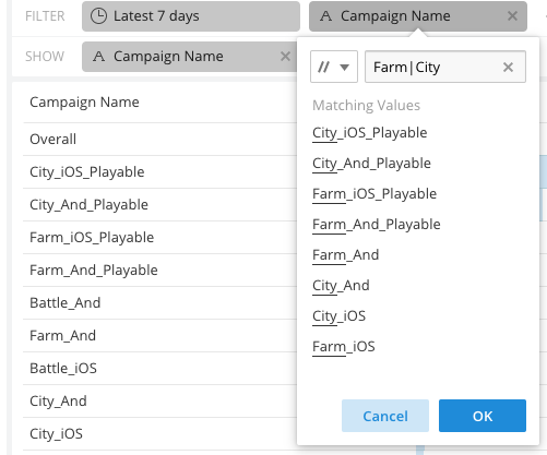 Apply filters to your data to gain powerful insight into campaign performance. You can apply filters to any dimensions. To refine a filter, drag a dimension to the + symbol next to the FILTER field, then click to open its context menu. Apply parameters using the following operations:Operation | Description |