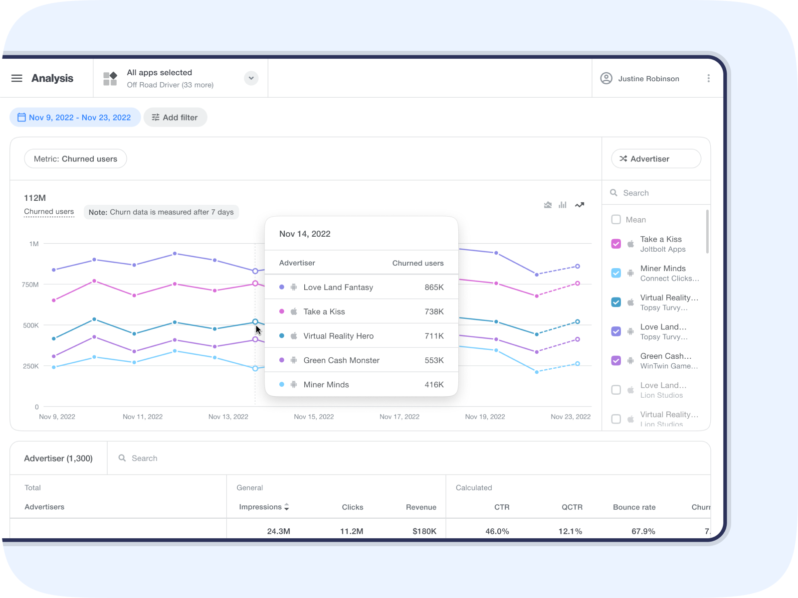 Use the Ad Quality Analysis page to monitor the impact that ads are having on your app and user experience. You can quickly visualize key metrics (such as churn per advertiser) and determine whether to report a creative to the ad source.