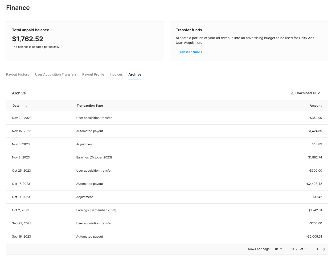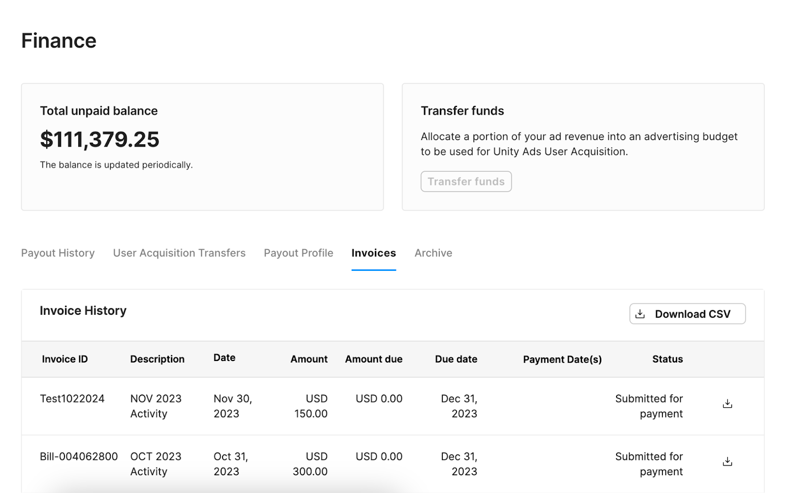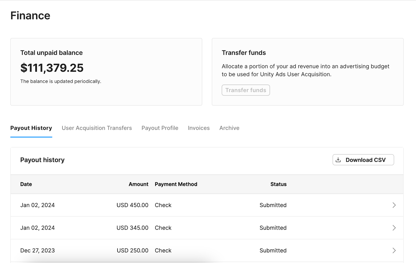 Publishers receive automated payouts for their Unity Ads earnings every month. Refer to Earnings payouts for details about how your payouts are calculated and paid. You can view records of your Unity Ads payouts from the dashboard at any time by selecting Finance from the left navigation bar. There are two tabs that provide details about your payout history: Payout History and Invoices. You can review payouts prior to January 2024 in the Archive tab.Payout History