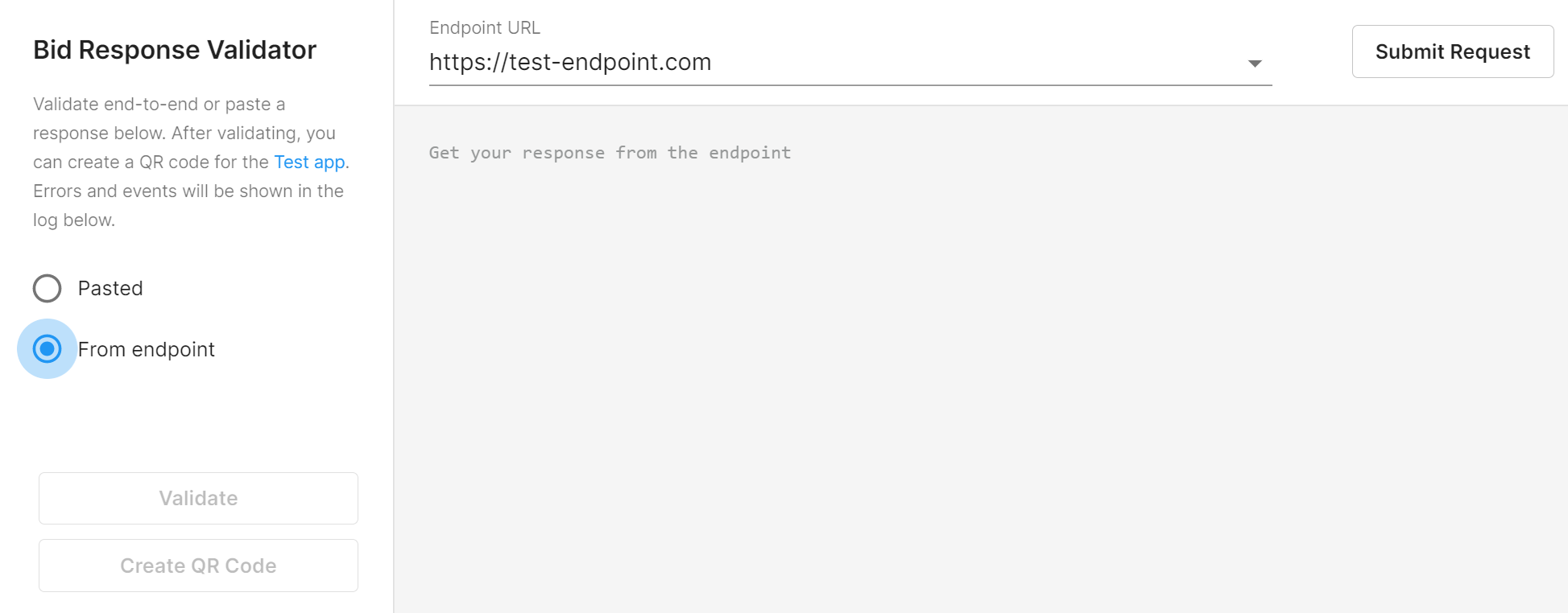 Alternatively, you can select the Pasted radio button, and then paste your response into the bid response validator. Select Validate to check the bid response. The result appears in the log: