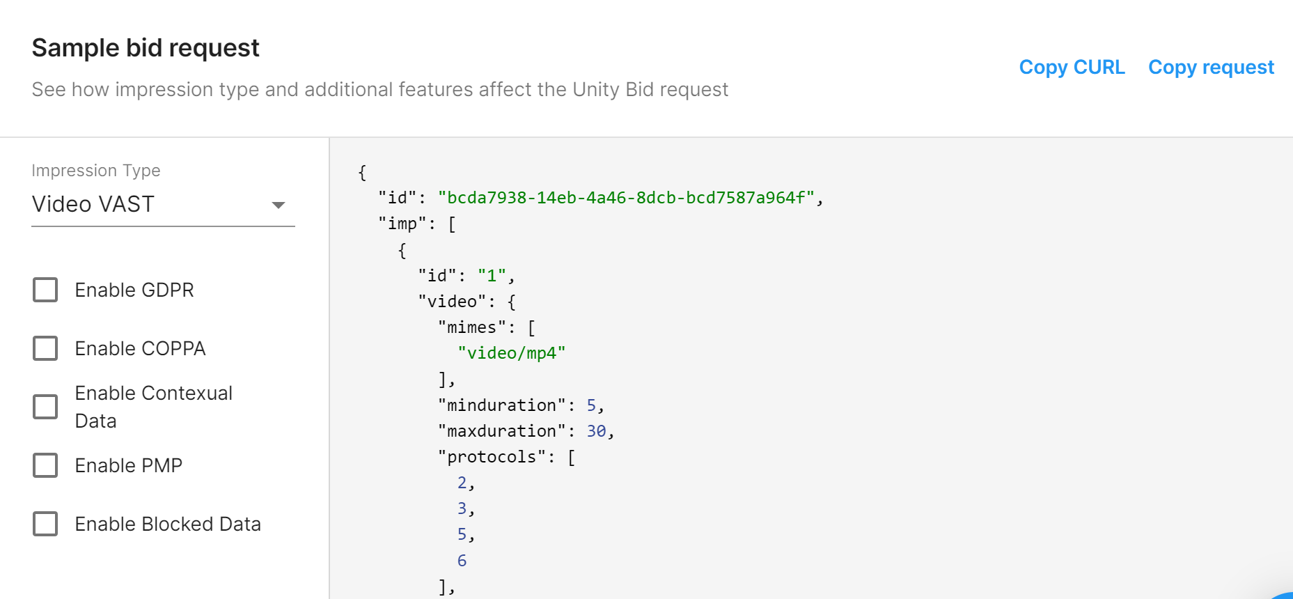 The Sample bid request section of the Testing page displays a sample bid request that is an example of the OpenRTB requests Unity sends to DSPs. Select different impression types from the drop-down menu and check applicable attributes to review an example of the bid request JSON.