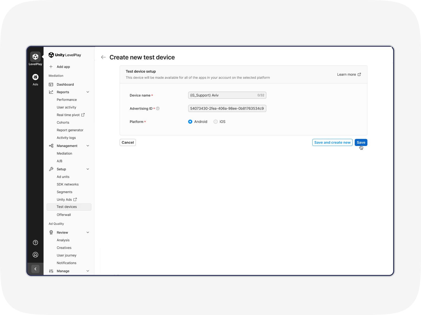 - Enter the Device Name and the relevant Advertising ID ( You can find your Advertiser ID using the integration verification tool). Select the OS platform and then click Save.