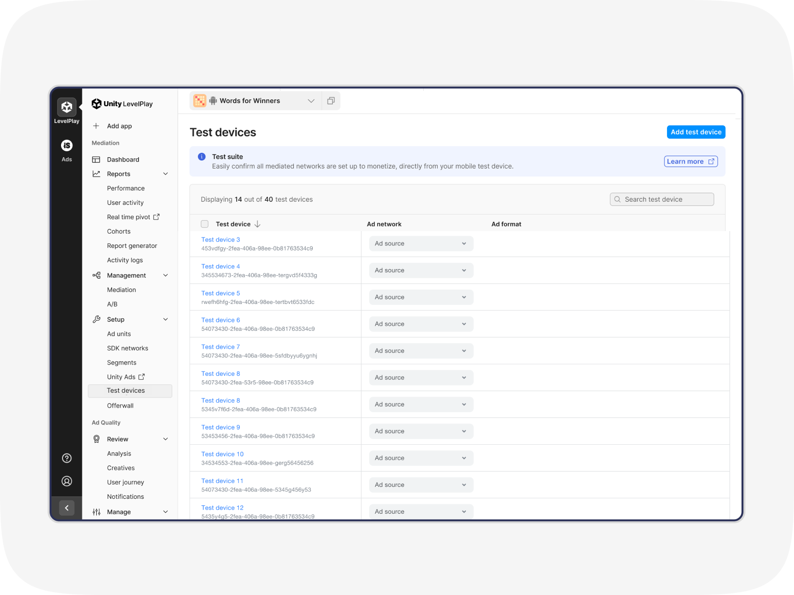 Confirm your configured mediated ad networks' are delivering ads on your test device. Follow these steps:- Go to Unity Levelplay in the left side nav bar and under Settings, select Test devices.