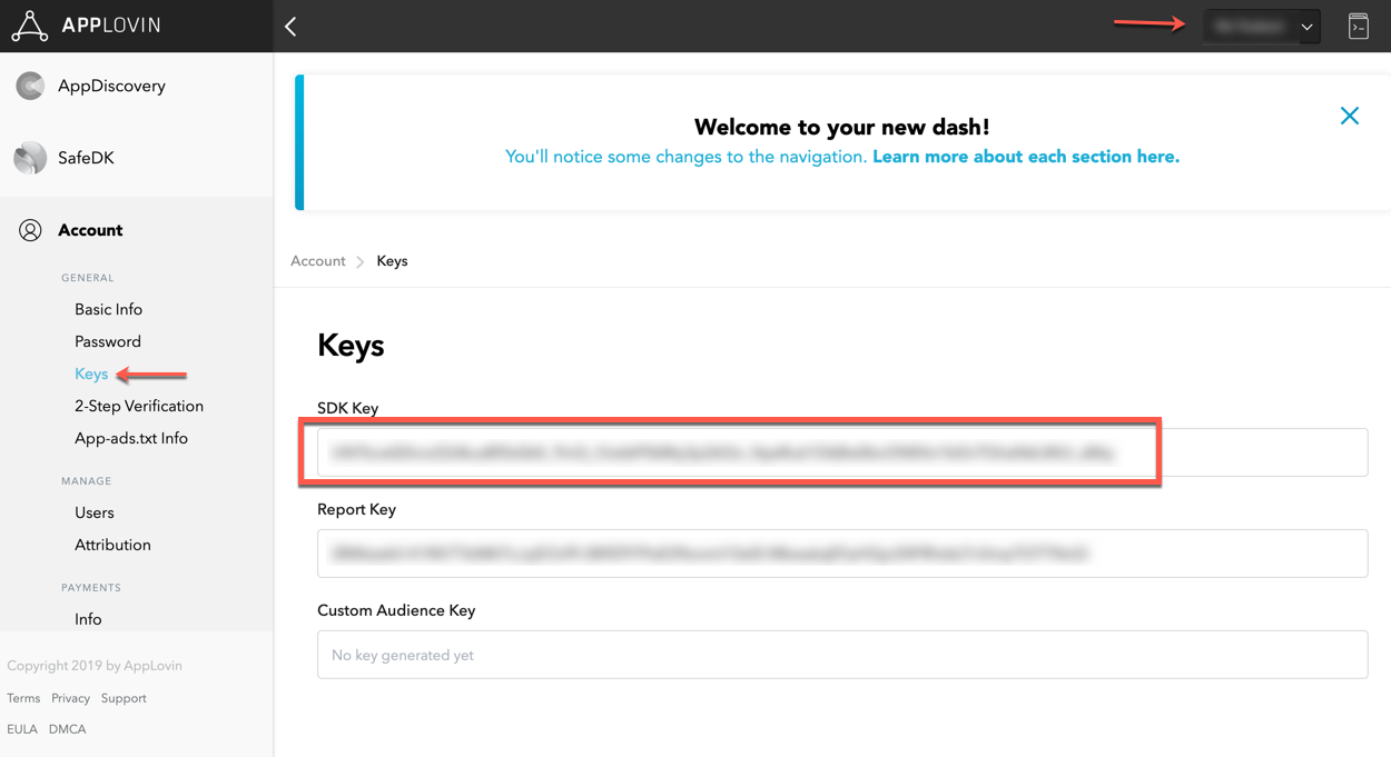 - SDK Key: This is a unique identifier for your AppLovin account. This is used by the LevelPlay Mediation SDK to Init the AppLovin adapter for your apps.