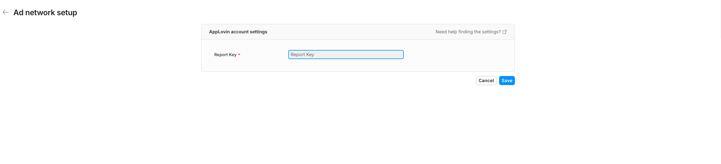 Select AppLovin from the list of available ad networks on the Manage Networks page. Then enter the Report Key on the Ad network setup page**, and** click Save.