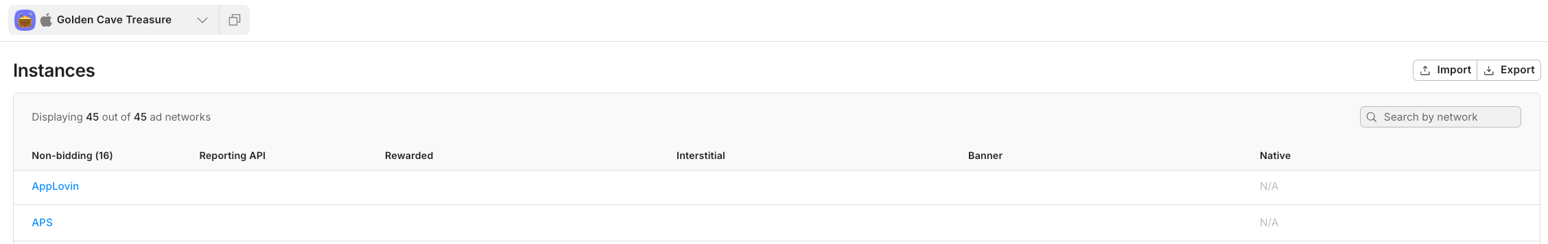 - Next, go to the Instances page from the left side nav bar. At the top of the Instances page, select the app on which you'd like to run Unity LevelPlay's Mediation with AppLovin.