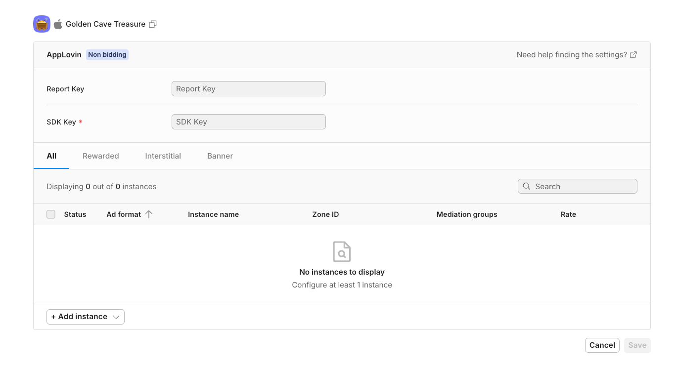 On the App settings page, insert the SDK key you retrieved in Step 2. Then, create an instance for each ad format (Interstitial, Rewarded ads, and Banner) you want to monetize with through Applovin. Click on your preferred ad format and click Add instance at the bottom of the page. Enter the required info and then then click Save.
