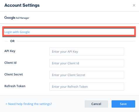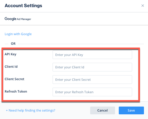 - Select Google Ad Manager from the list of Available Networks and enter the Ad Manager's API Key, Client ID, Client Secret, and Refresh Token; or click the Login with Google option.