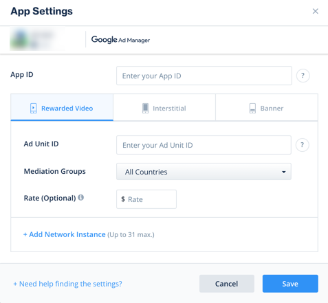 - Configure Google Ad Manager's parameters in your LevelPlay account.
