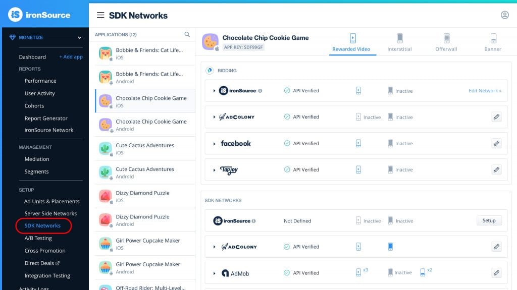 - Log in to your ironSource account and go to Monetize > SETUP > SDK Networks.