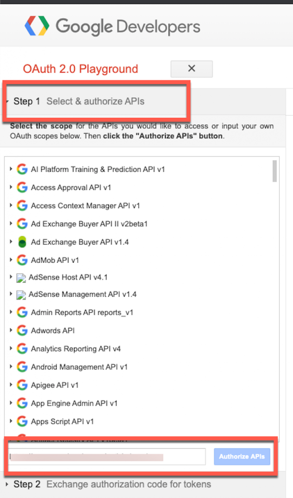 - Next, in Step 1: Select & Authorize APIS, enter https://www.googleapis.com/auth/admob.report and click Authorize APIs.