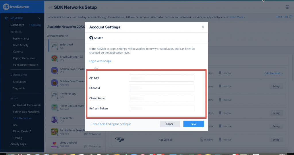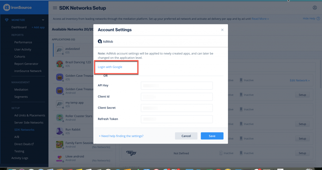 - Select Admob from the list of Manage Networks and enter the Admob Client ID, Client Secret and Refresh Token or click the Login with Google option.