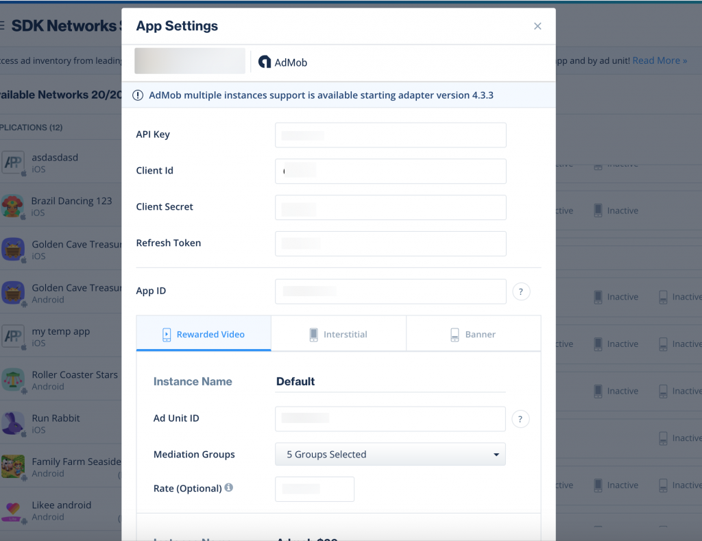 Next, you must add your app and set up Ad Zones in your AdMob account. AdMob does not allow setting up more than 3 ad zones of the same Ad Type in the same setup.for example no more than three Rewarded ads are allowed for the mediation group.