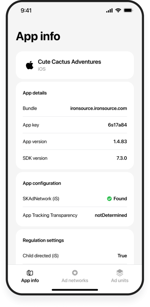 After you've launched the test suite on your app, you can review your app info in one place, based on the device and init response parameters. The following data is available in the App info tab:- App details