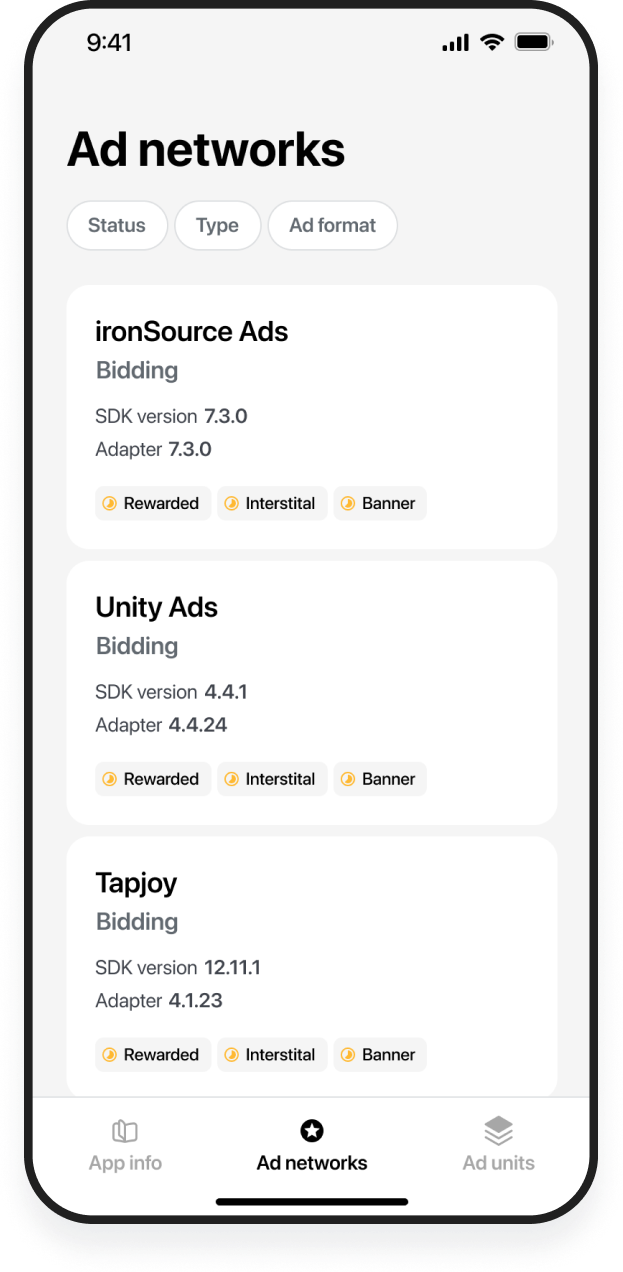 The test suite will automatically check that you've installed an SDK and adapter for each ad network after it's been launched. Then you can review and filter ad networks based on the integration status. If the integration is successful, the SDK and adapter versions will be displayed. If the integration is incomplete, the versions won't be visible on the screen. Follow the Add Mediation networks guide to complete the network integration.Ad formats status