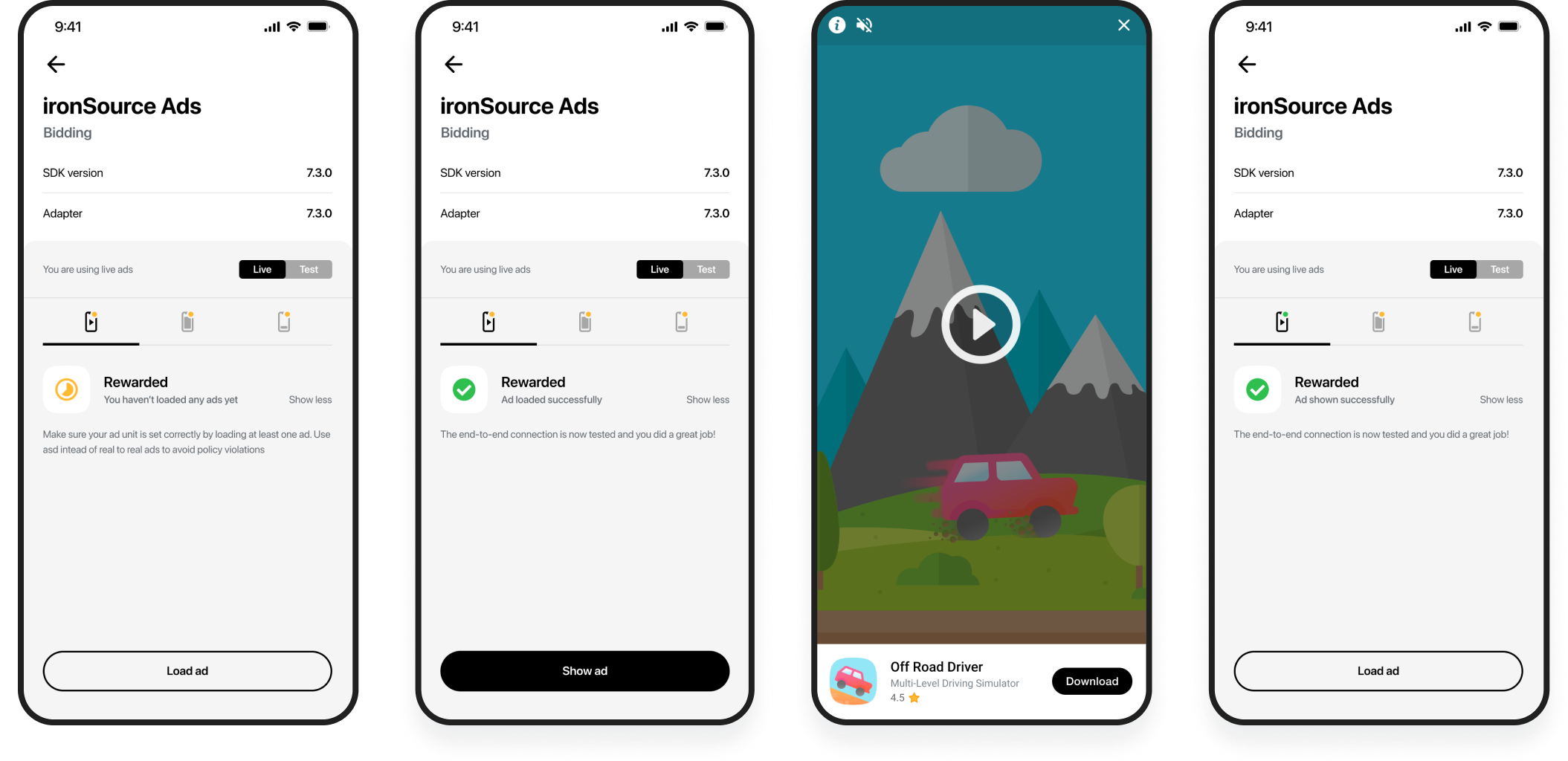 - Red: Ad load or show fail. The reason for the failure will be displayed on the screen.