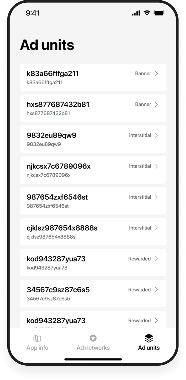 The ad units tab displays the list of all ad units sorted alphabetically for the corresponding app key used to initialize the LevelPlay SDK. It will indicate the ID and the ad format of every given ad unit.