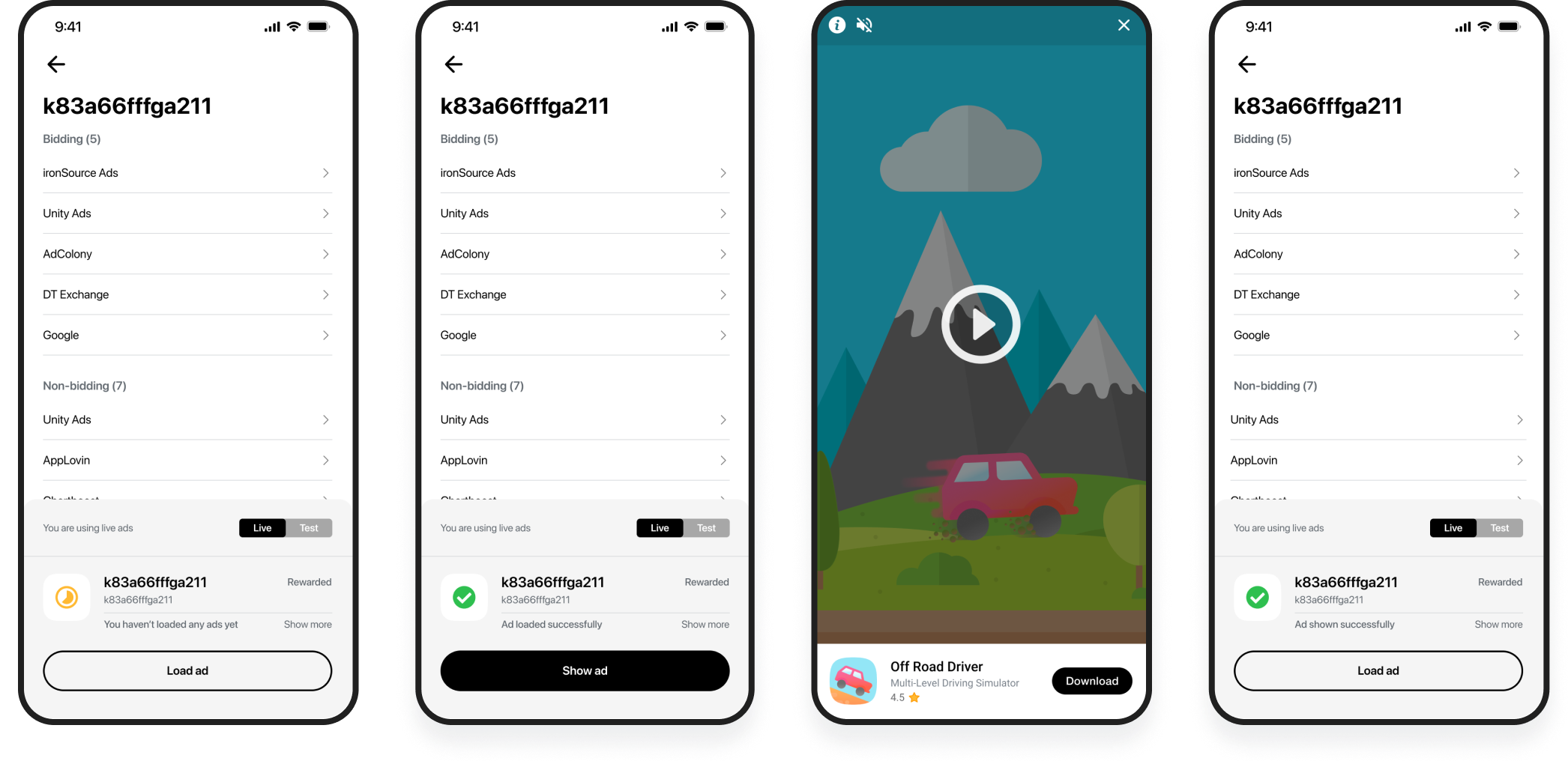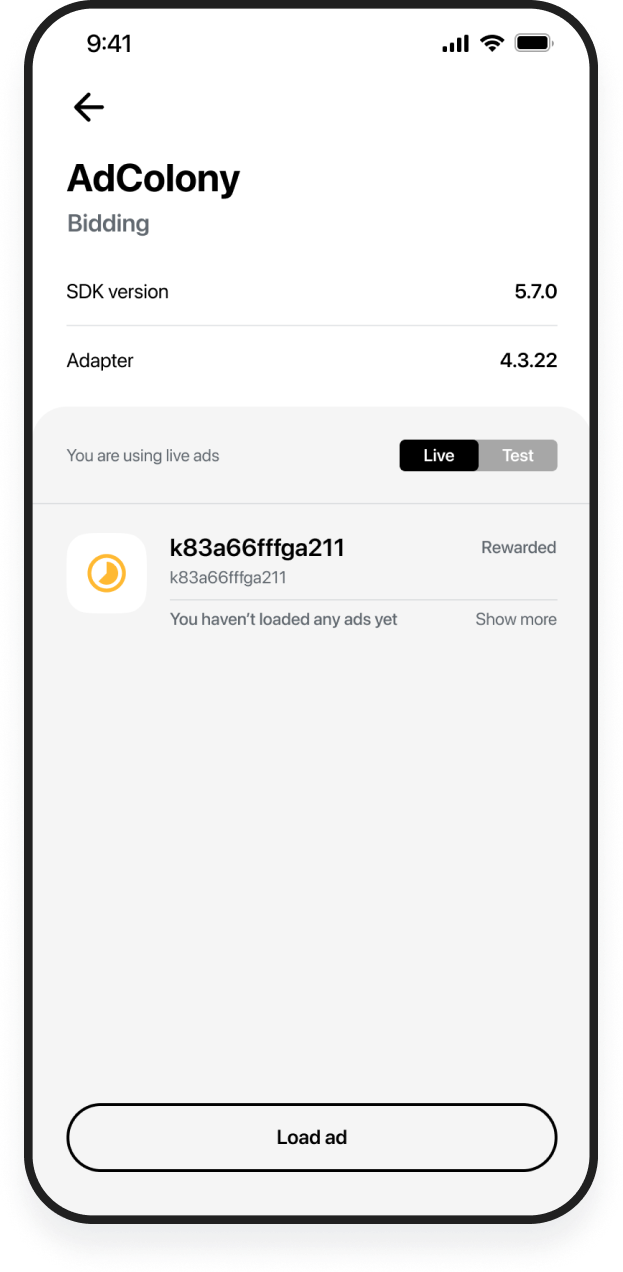 Click a single network to start testing ad loads for each ad format. You can only select ad networks that have an SDK and adapters installed. Select an ad format and click the Load ad button to request an ad. The screen will indicate the status of the ad:- Green: An ad was loaded or shown successfully