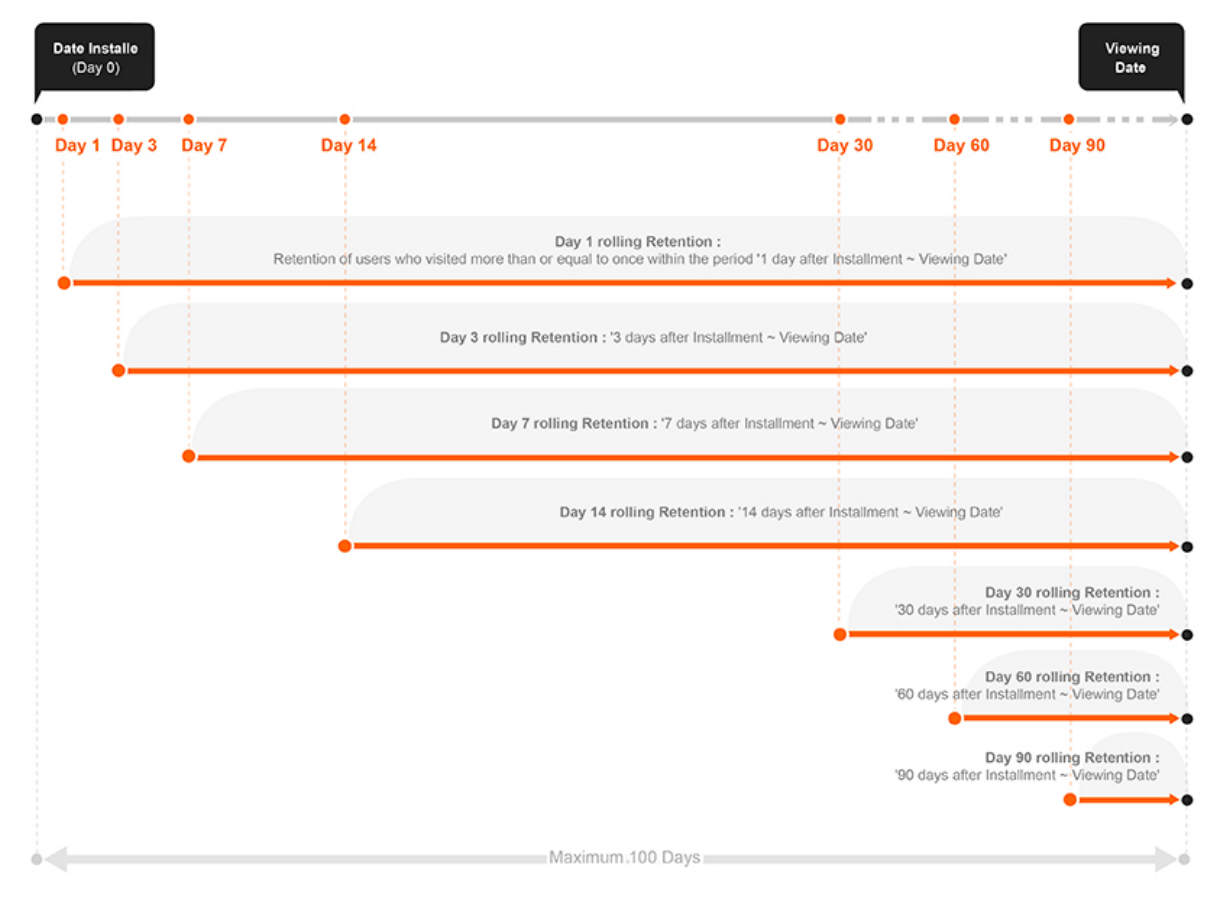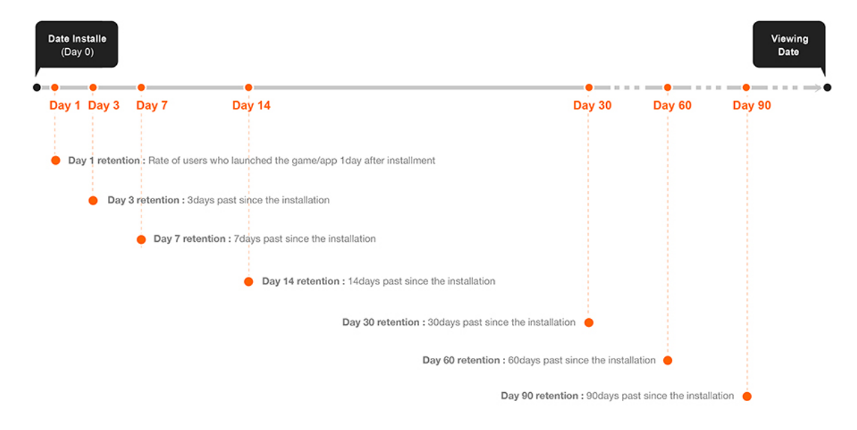 Retention is a snapshot. We calculate the percentage of users who ran your application exactly 1/3/7/14/30/60/90 days after the date of installation, with users who ran the application at least once as the denominator.