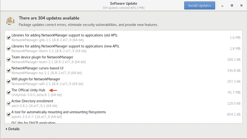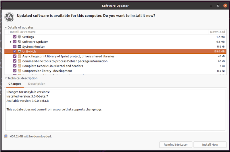 Once you've configured the Unity Hub repositories in your package managers, the Hub automatically checks for a new version periodically based on the configurations defined in the operating system settings. You might receive the following popups from your Software Manager when a new version is available.Debian / Ubuntu
