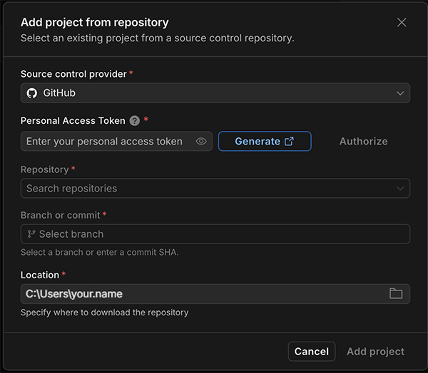 - In the Add project from repository window, expand the Source control provider dropdown and select GitHub or GitLab.