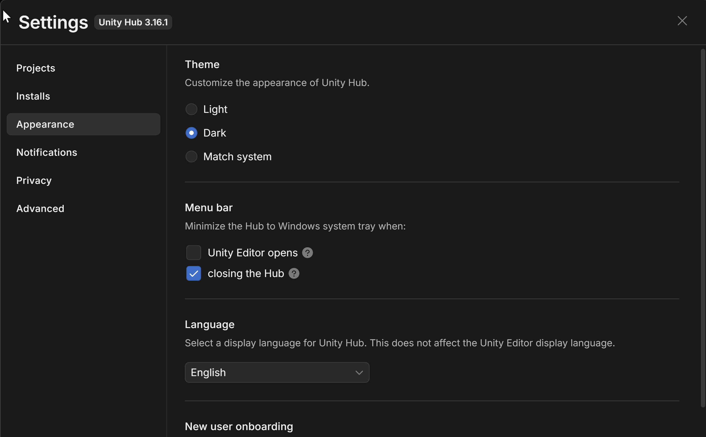 | Language | Specifies the display language for the Hub. Does not affect the Unity Editor display language. |
