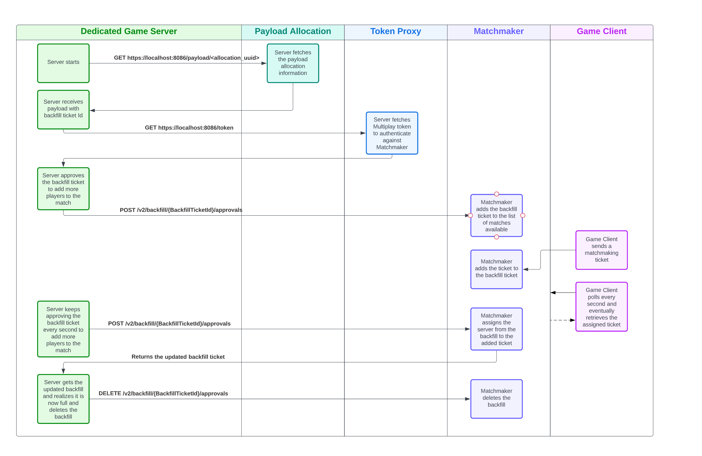 - When the server is allocated, it fetches the allocation payload information and the Matchmaking Results. The Matchmaking results contain the backfill ticket ID that was created by the matchmaker as well as important information needed to create backfill tickets.