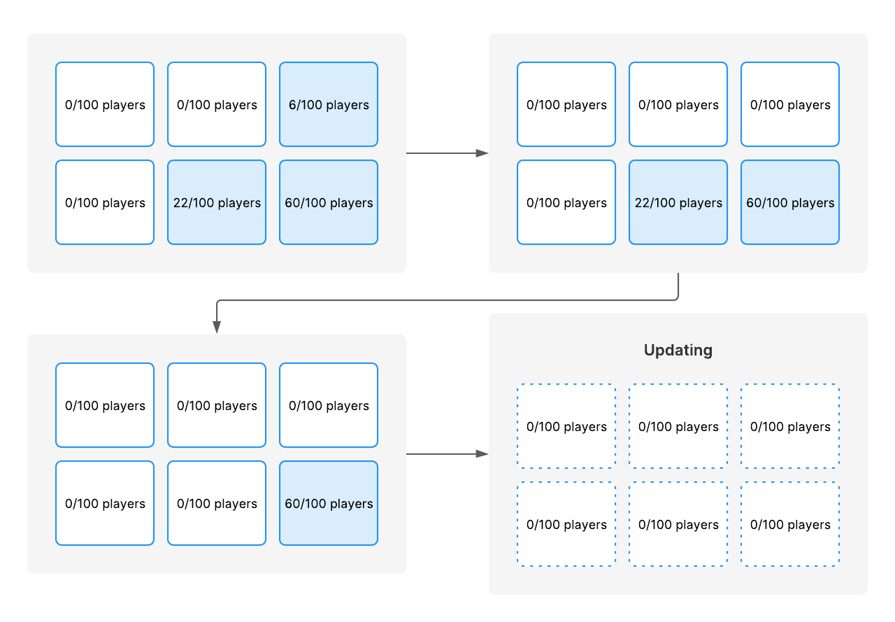A progressive rollout is a method of deploying a build update where you update servers only when they're empty. Multiplay Hosting waits for your matchmaker to deallocate the server if it has any connected players.