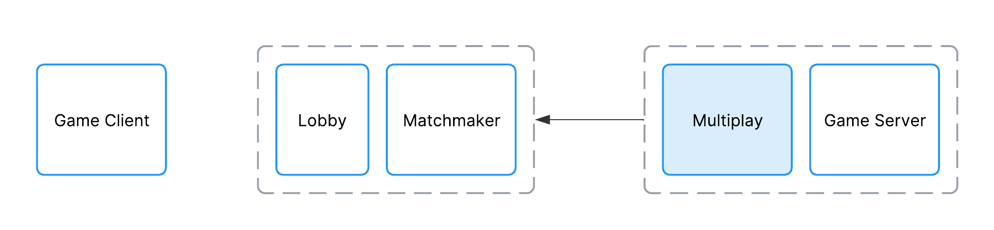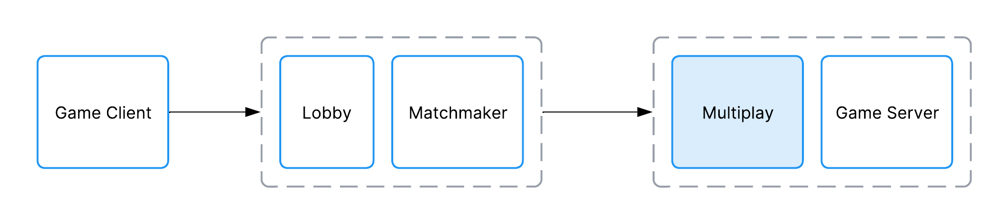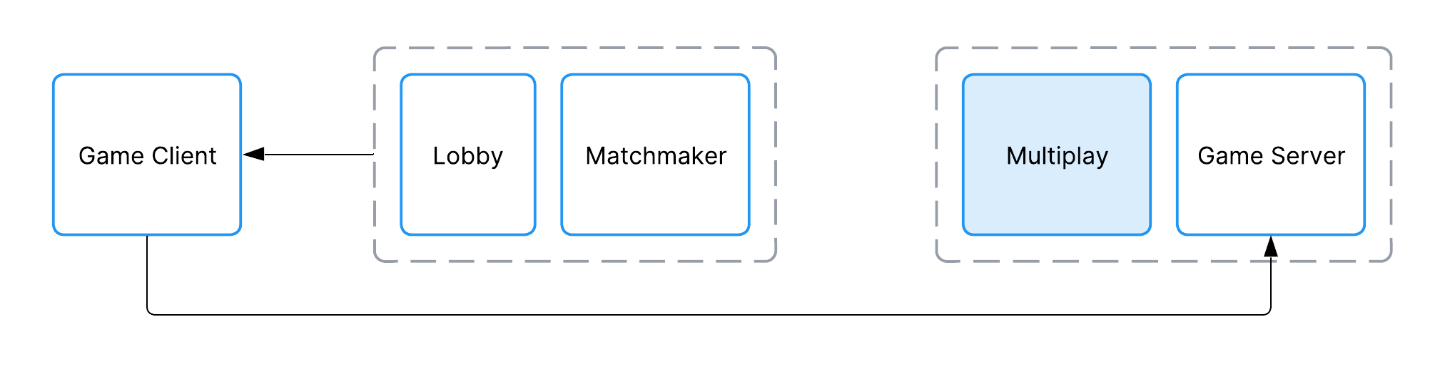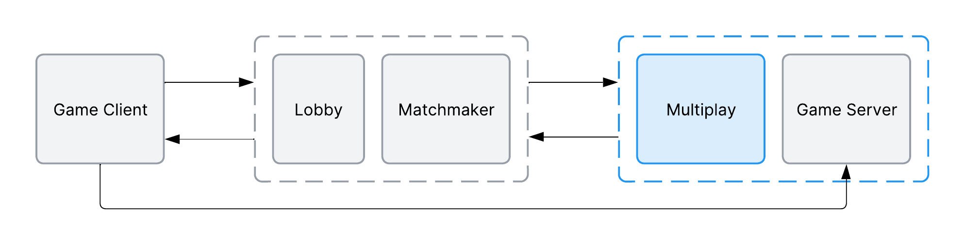 A flowchart demonstrating the first part of a typical multiplayer connection flow, where the game client communicates with Matchmaker and Lobby, and Matchmaker communicates with Multiplay Hosting.