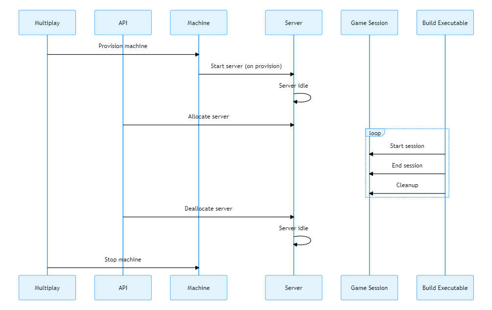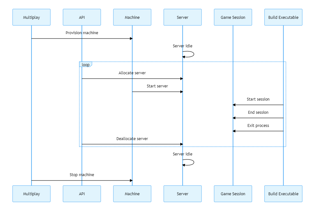 The server lifecycle is the lifecycle of the build executable as a process running on a machine with protected resources. It has three distinct stages: The beginning and end of the server lifecycle varies depending on the requirements of your game. It might start well before or immediately before the allocation lifecycle, and it can end after each allocation or continue for many allocations.
