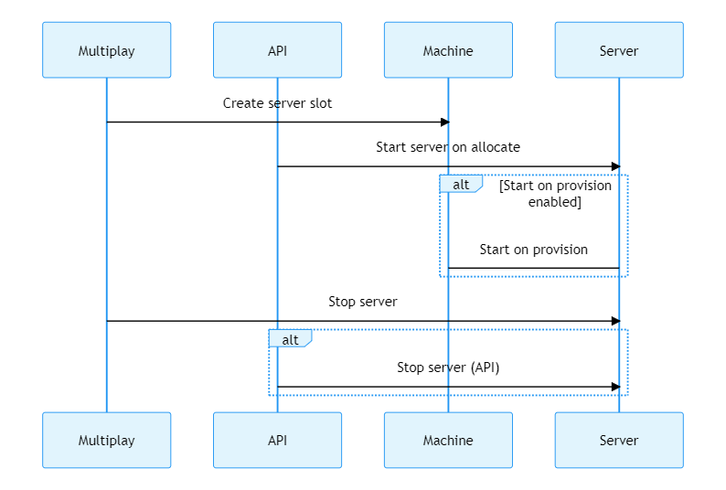 The second stage of the server lifecycle involves using information (such as the build and configuration options) to start the build executable (or Docker image) as a process in the server slot created during the first stage. When the server starts depends on the requirements of your game. It usually starts in response to an allocation request or when Multiplay Hosting provisions a machine (depending on whether you have the start on provision setting enabled for the fleet). Other situations in which a server starts include:- You created an allocation, and Multiplay Hosting selected a server slot that isn’t running the correct build executable. In this case, Multiplay Hosting restarts the build executable with the correct build.