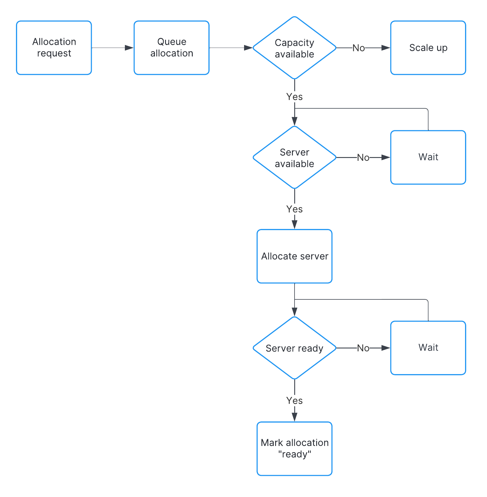 A flowchart showing that the server readiness step of the overall allocation flow happens between the Allocate server step and the Mark allocation ready step.