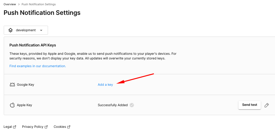 You need to add an Apple key, project, and account details to your Unity project settings before sending notifications to Apple devices. You can reuse the same Apple key between games, environments, and development and production builds in the Unity Dashboard (go to step 8 if you already have one). This needs to be done for every UGS environment of the game that you expect to test or use notifications with.