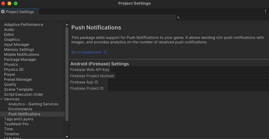 Go to Player Engagement > Notifications > Settings for your project in the Unity Dashboard, click the