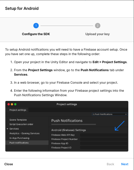 To send notifications from the Unity Gaming Services dashboard, you need to upload service keys from Firebase for Android and from your Apple Developer account for iOS.