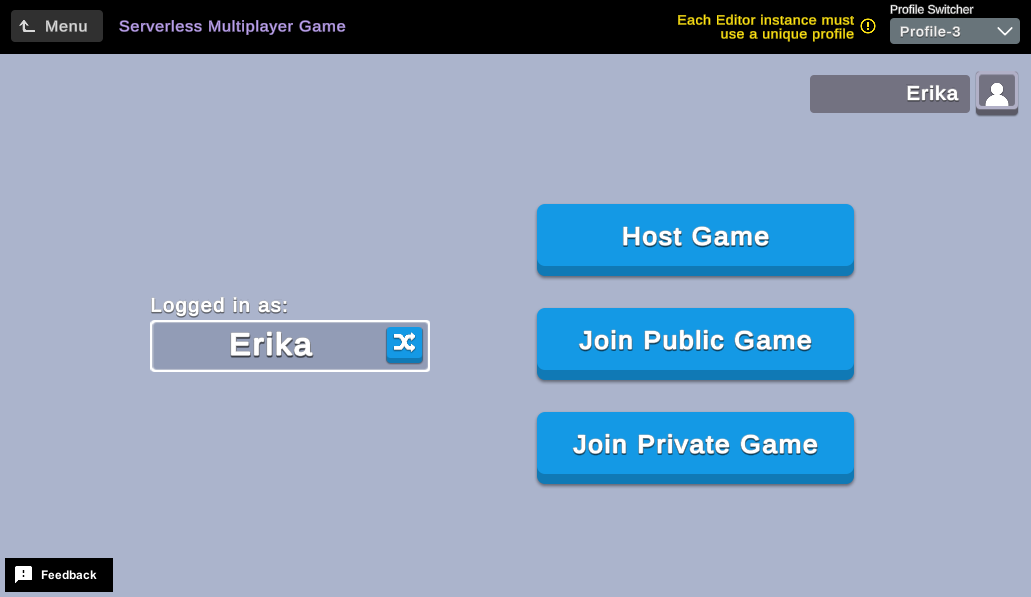 Always begin Play Mode with theServerlessMultiplayerGameSampleServerlessMultiplayerGameSample scene